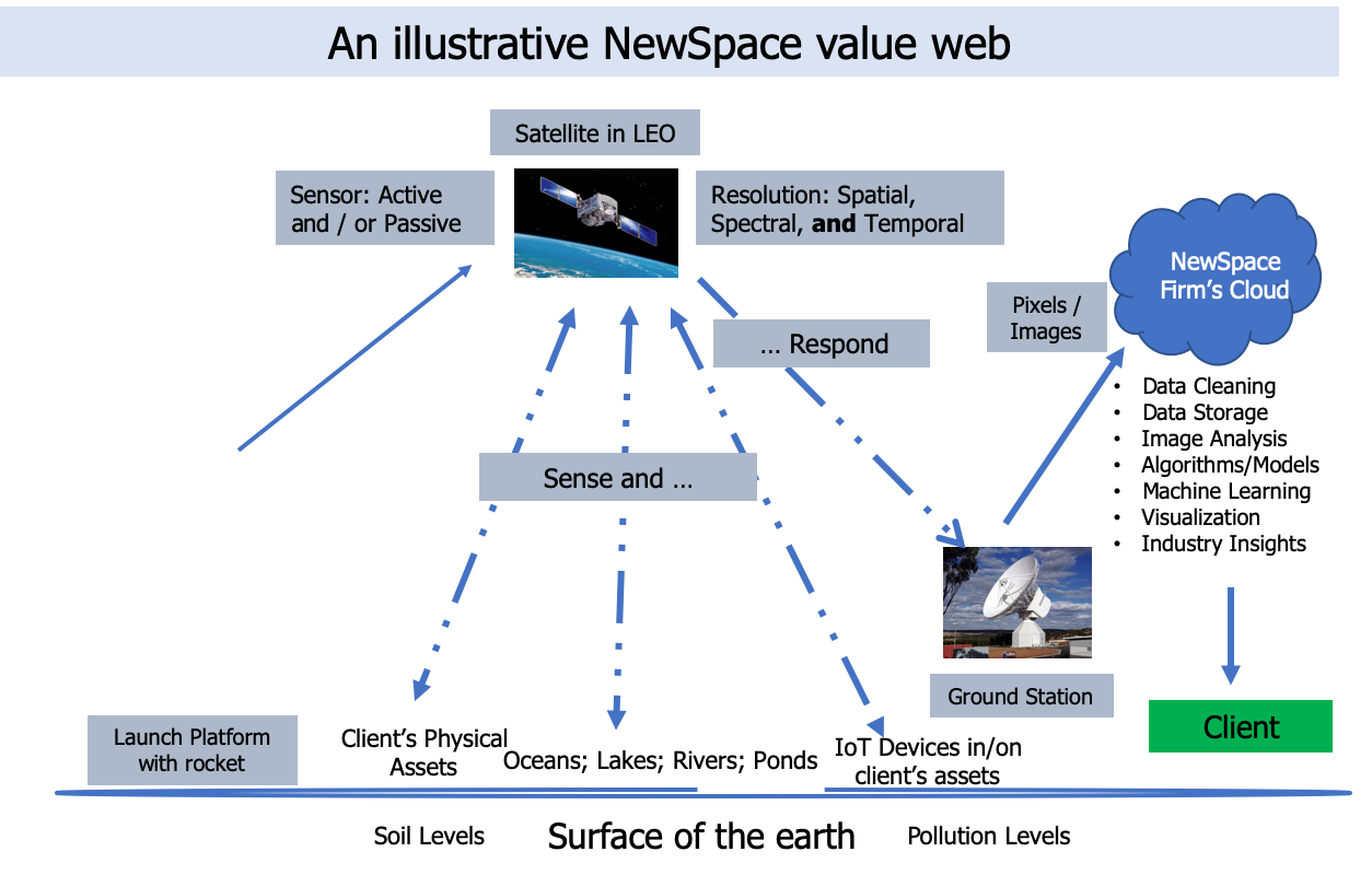 - NewSpace firms that only offer information solutions (raw imagery, terrestrial visuals, data, analytics, algorithms and models, vertical insights) are dependent to a – lesser or greater – degree on all the elements of the value web working together correctly.