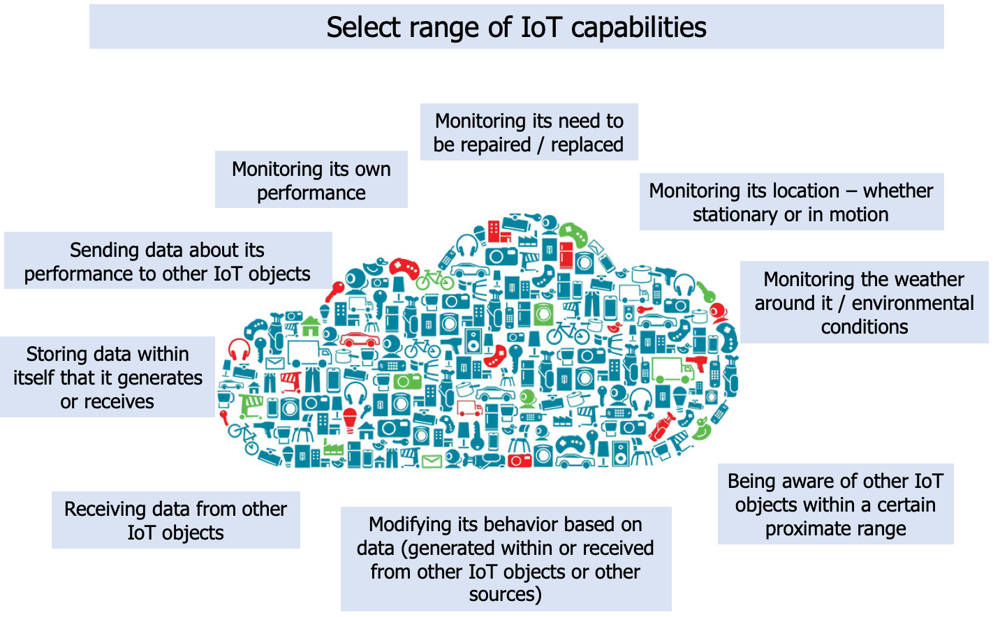 As an example of some IoT capabilities, consider the following diagram. Without getting into each element of the diagram, IoT capabilities encompass both passive and active monitoring and management. There will be extensive flows of data (almost all unstructured) moving among and between IoT objects, data repositories, analytical engines, user-friendly (I hope) dashboards, alerts, and responses.