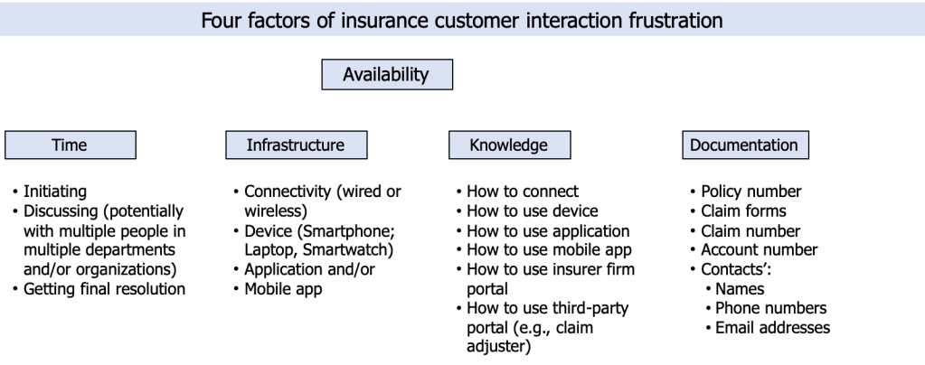 Moreover, needing to have any or all of these four resources available at all or in part can be factors that contribute to customer interaction frustration. (See Figure of four factors of insurance customer interaction frustration.)