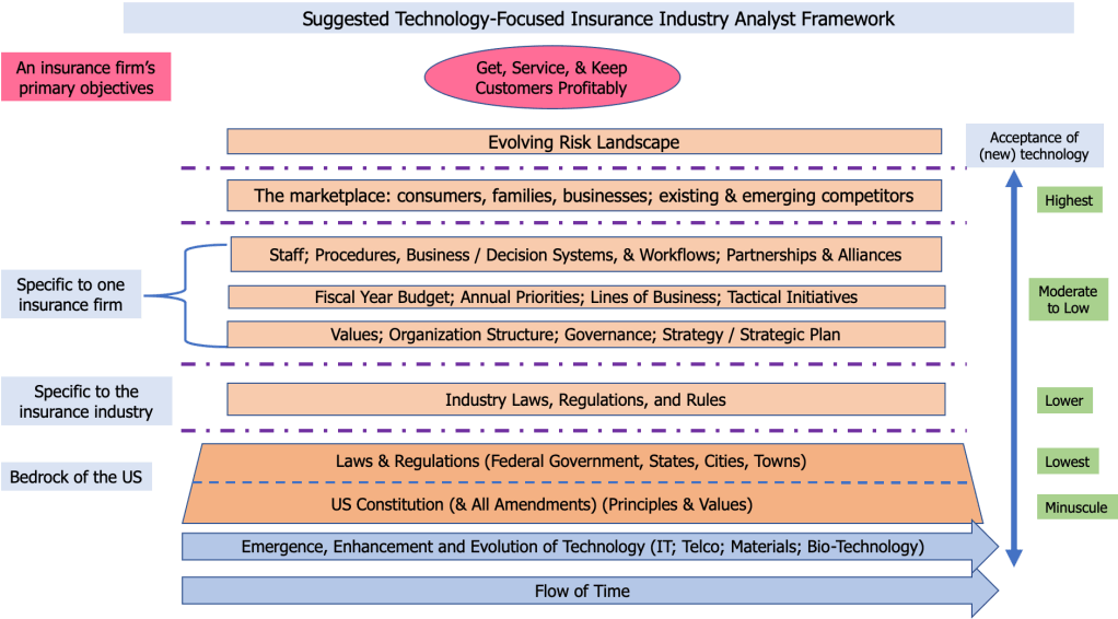 The visual captures the insurance firm’s primary objectives; the evolving risk landscape; key elements of the marketplace; factors specific to any one insurance firm; factors specific to the insurance industry; bedrock forces of the United States (analysts in other countries should obviously replace these with their country’s counterparts); the emergence, enhancement, and evolution of technology (beyond IT and Telco to encompass other technologies that impact one or more major lines of insurance); a gradient capturing the acceptance of (new) technology; and the flow of time.