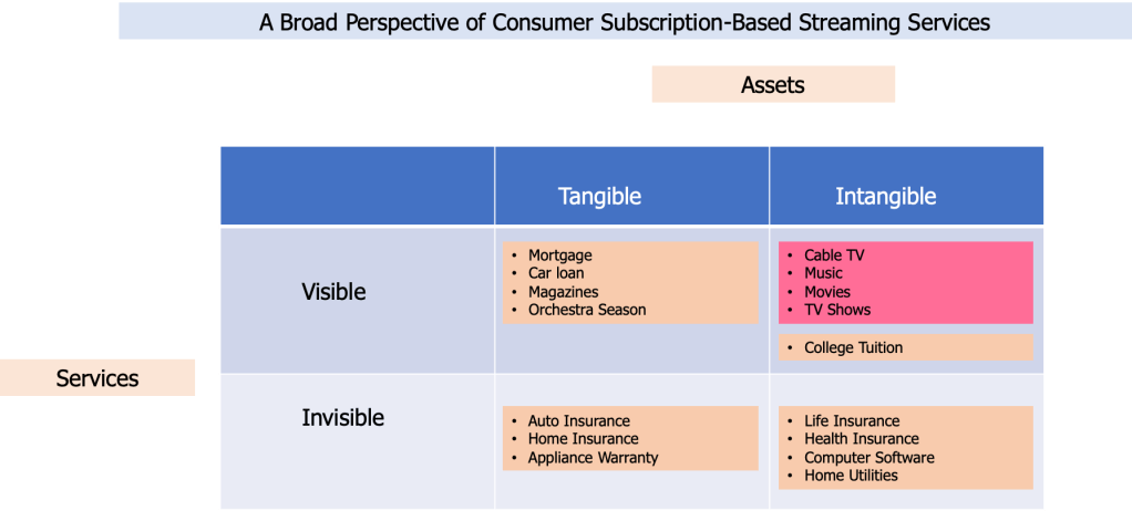 A heuristic that provides a lens into this situation is a visual that captures assets (tangible assets, intangible assets) and services (visible services and invisible services). This framework – with some examples – captures a broad perspective of consumer subscription-based streaming services. (See visual below.)