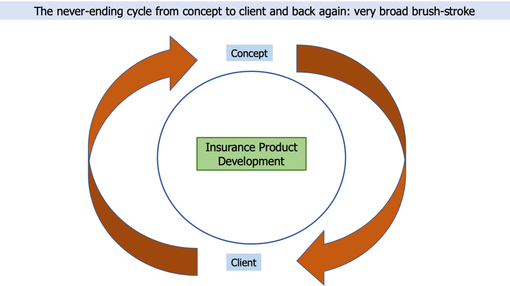 The other point I am making – and illustrating in the visual – is that the insurance product development process is, or should be, a continual, never-ending cycle that moves to concept to client and back again. (With my apologies to J.R.R. Tolkien for using that phrasing.)