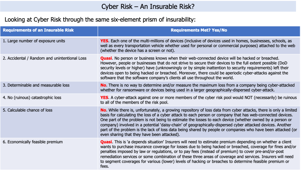 Turning now to cyber risk, I use the same six points of insurability (or uninsurability depending on your point of view) to conclude that cyber risk is uninsurable.