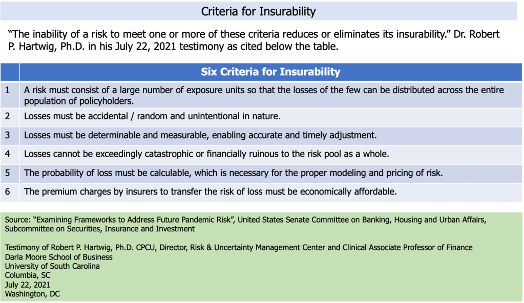 Here I introduce some of the content from Dr. Hartwig’s July 2021 Testimony. I’ll let the table below ‘speak for itself’ but I will repeat his point that “The inability of a risk to meet one or more of these criteria reduces or eliminates its insurability.” (My emphasis of bold and underlining of Dr. Hartwig’s point.)