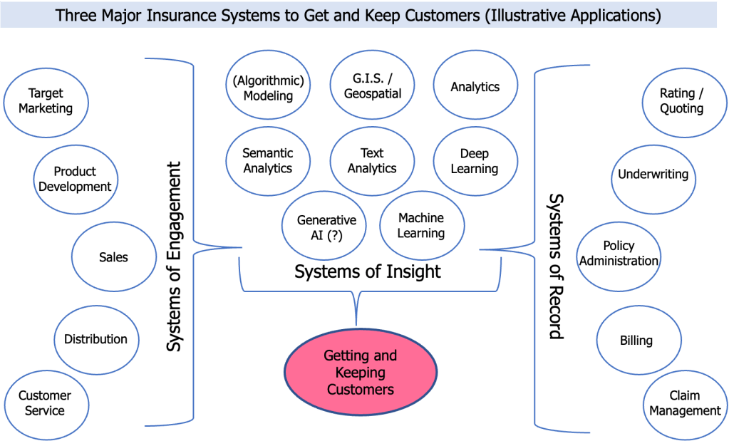Delving into insurance commerce just a tad deeper, we immediately come to major insurance systems that enable the various transactions and interactions that are the essence of communications and collaboration to get-and-keep customers: Systems of Record, Systems of Engagement, and Systems of Insight. (See visual of three major insurance systems.)