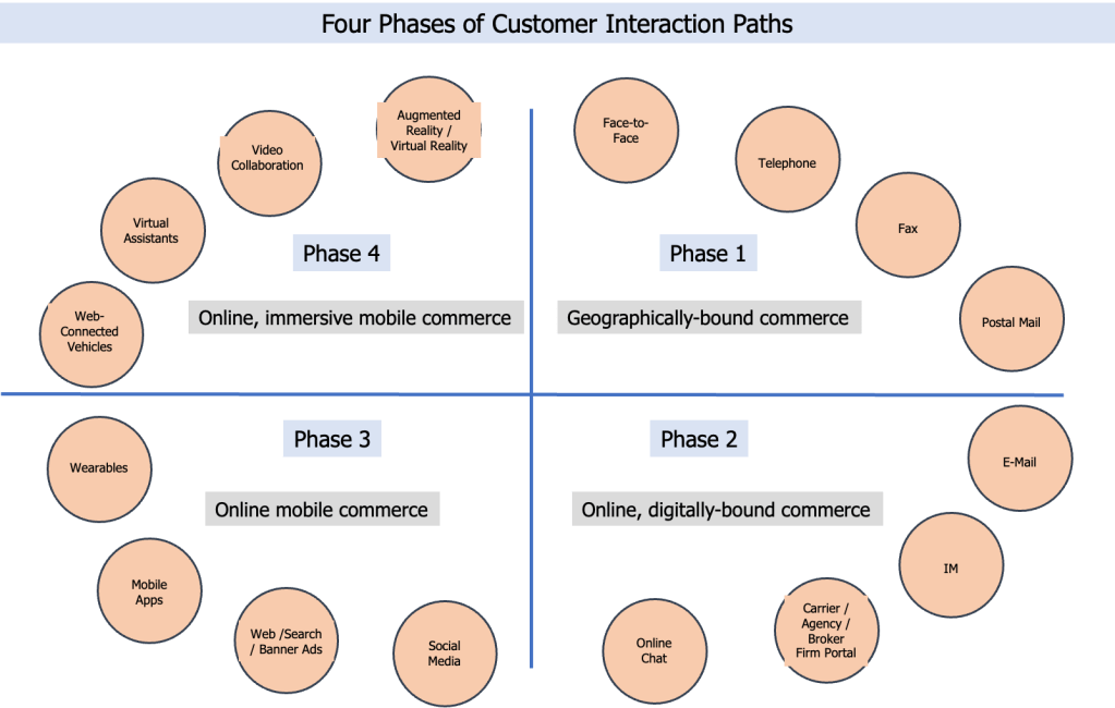 I believe that there has been an evolution of the nature of customer interaction paths that have encompassed four phases (see the visual for the different types of commerce capabilities in each phase):