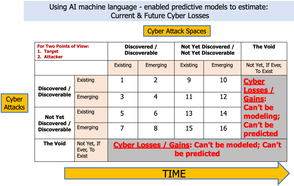 This world of cyber risks is a continually expanding Nth dimensional world (e.g. spreading like an alien spore expanding in all dimensions in space from some science fiction horror movie) and the risks will mostly be neither identifiable (until the attacks have occurred) or measurable beforehand.