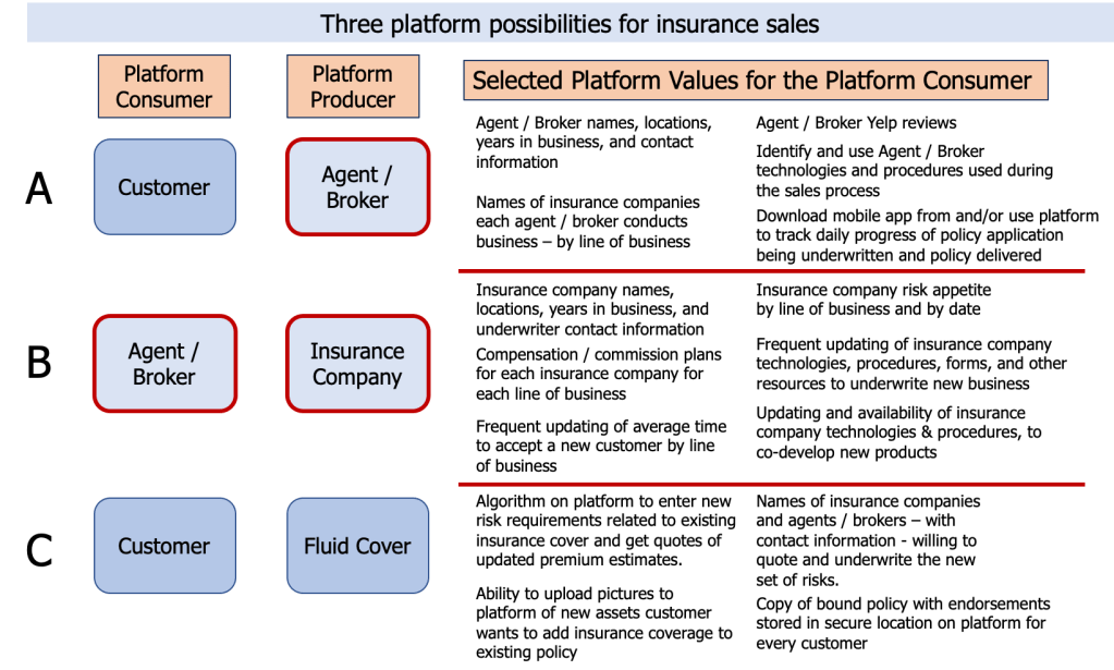 To simplify my discussion, I am writing about three specific pairs where the first actor of the pair is the ‘platform consumer’ and the second actor of the pair is the ‘platform producer’: customer – agent/broker, agent/broker – insurance company, and customer – fluid cover.
